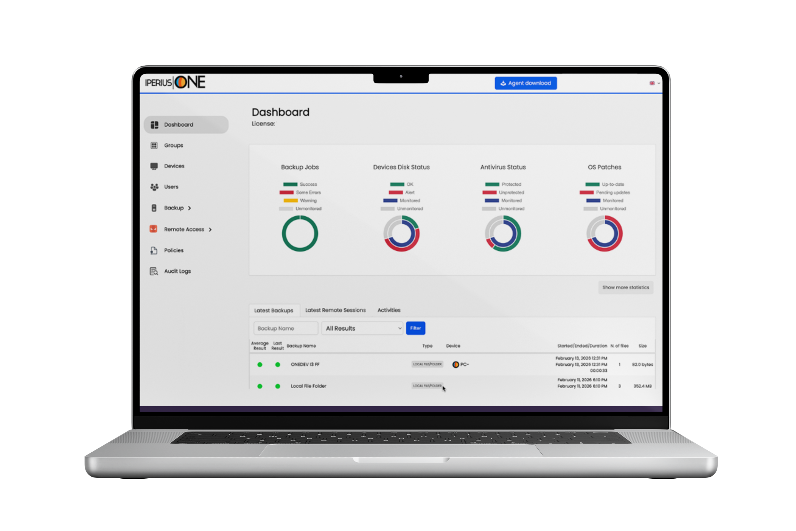 Iperius One se positionne comme une plateforme unifiée qui regroupe les fonctionnalités d’Iperius Backup, d’Iperius Console et d’Iperius Remote au sein d’un tableau de bord web unique et centralisé. En d’autres termes : RMM + sauvegarde + accès à distance dans un écosystème unique, avec des licences modulaires permettant d’activer uniquement les modules nécessaires.