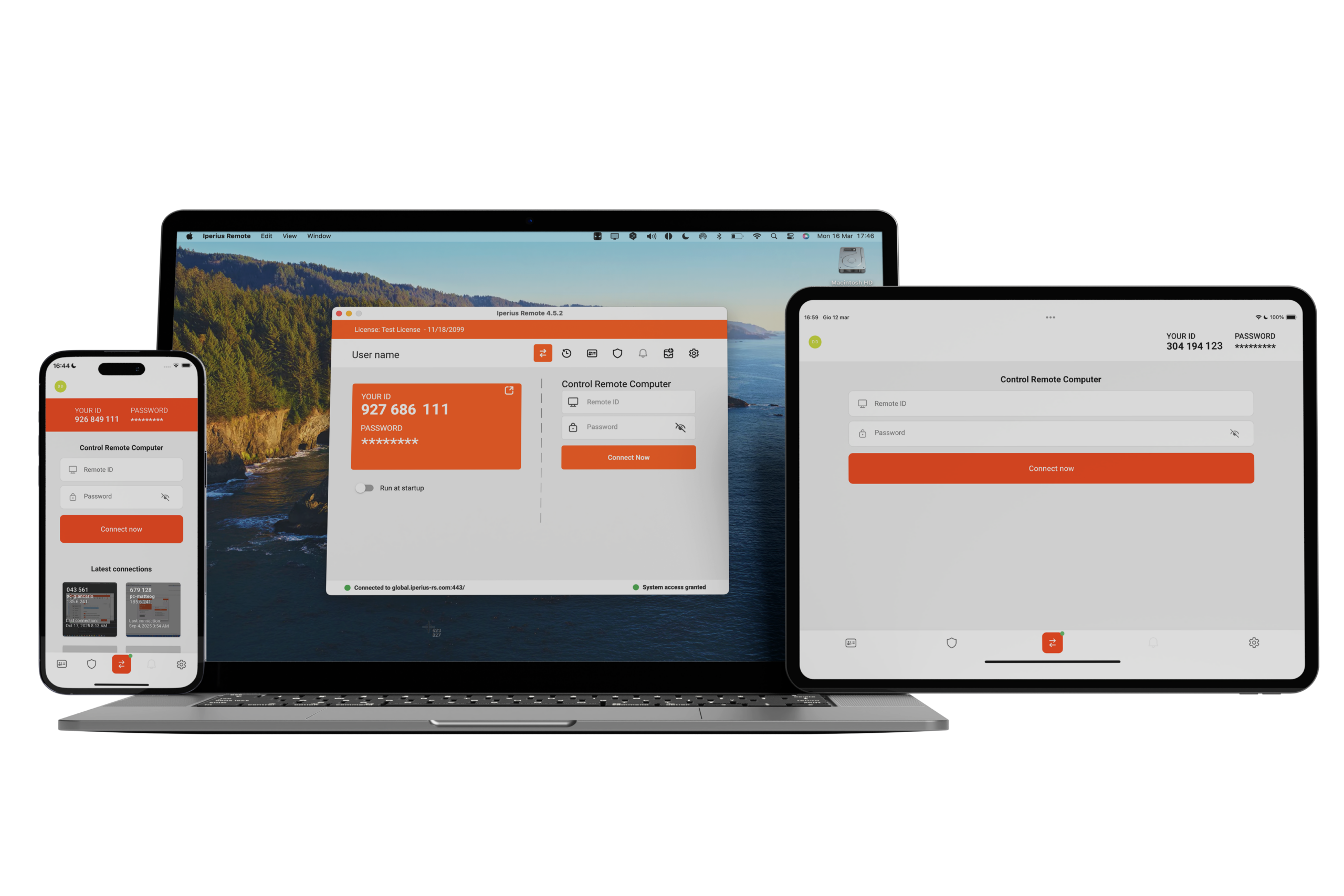 - Accès à distance intégré à Iperius Remote, avec connexion « en un clic » depuis le tableau de bord et maintenance des fonctionnalités d’Iperius Remote (carnet d’adresses, statistiques, transfert de fichiers, chat, accès sans surveillance).